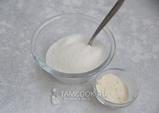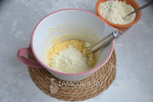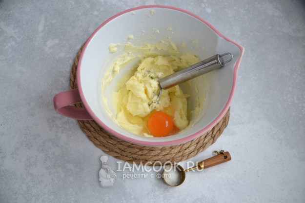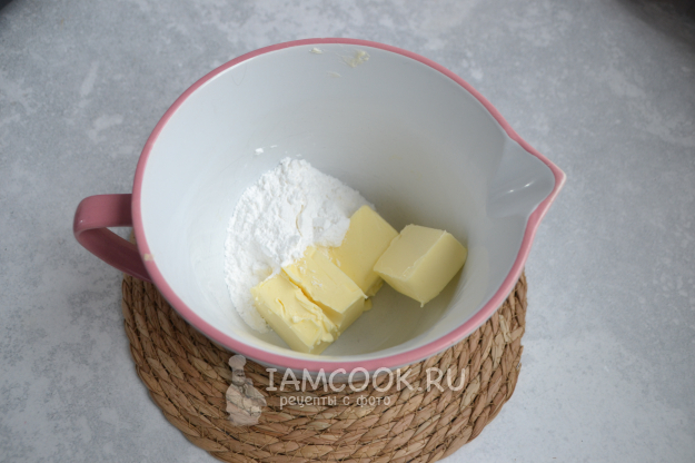 Займитесь приготовлением теста. В чаше для смешивания смешайте мягкое сливочное масло с сахарной пудрой.
