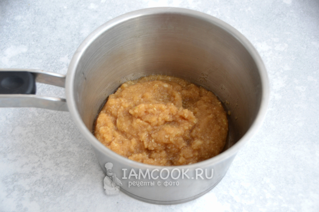 Добавьте нарезанные яблоки к яблочному пюре, смешайте.