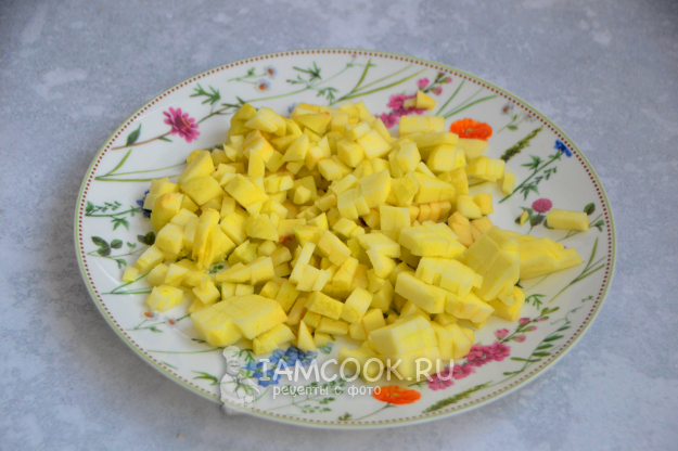 Отмерьте еще 240 г очищенных яблок, нарежьте их мелким кубиком.