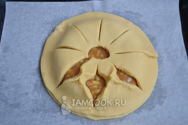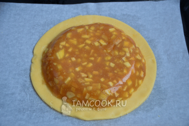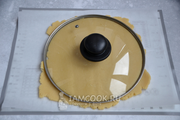 Раскатайте одну часть теста в пласт. Вырежьте круг диаметром 24 см, толщиной около 4 мм, переложите на лист для выпечки. Лучше делать это сразу на пергаменте для выпечки.
