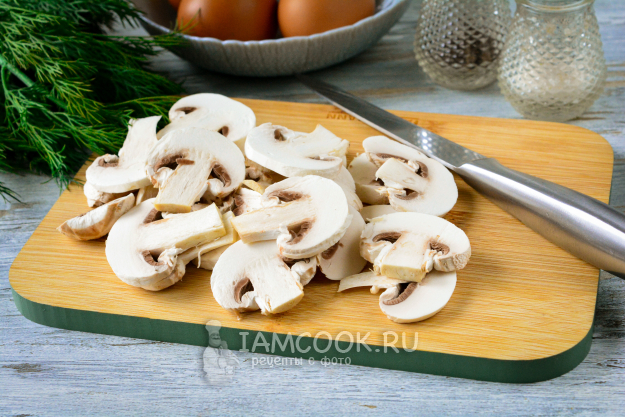 Почищенные шампиньоны нарежьте пластинами.