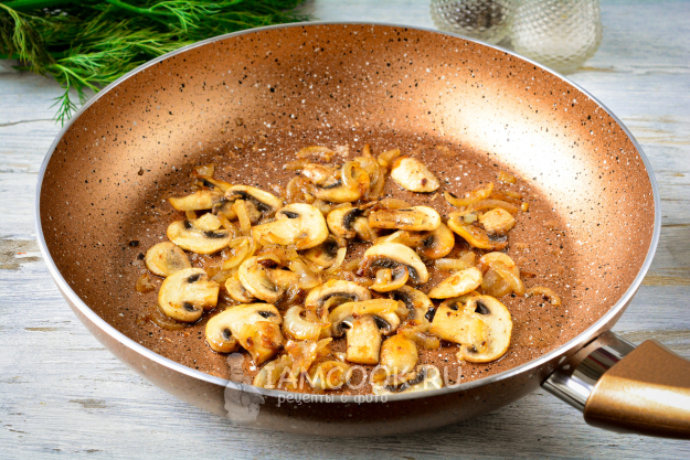 Растопите сливочное масло на сковороде, всыпьте грибы с луком и чесноком. Обжаривайте грибы с овощами 2-3 минуты, чтобы подрумянились. Чеснок придаст грибам дополнительный аромат. Добавьте соль и черный перец по вкусу.
