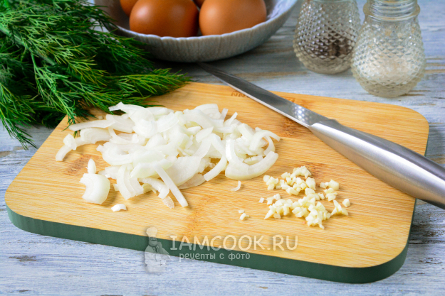 Почистите репчатый лук и зубчик чеснока, лук нарежьте полукольцами, а чеснок - мелкими кусочками.