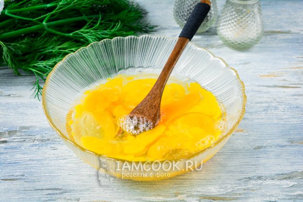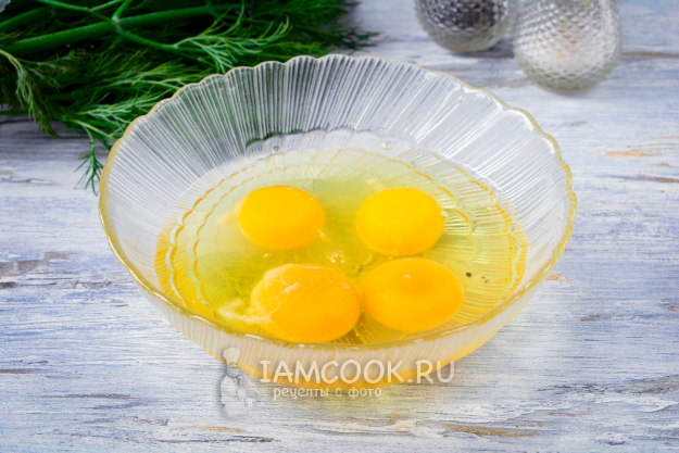 Вилкой перемешайте яйца, чтобы белки соединились с желтками. Сильно взбивать не нужно, достаточно просто перемешать.
