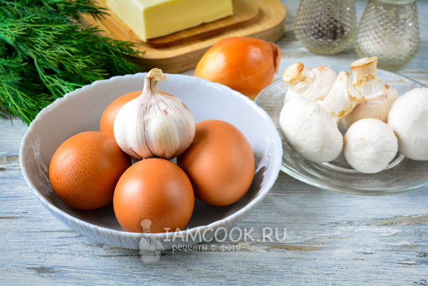 Соберите все ингредиенты для приготовления скрэмбла с грибами.