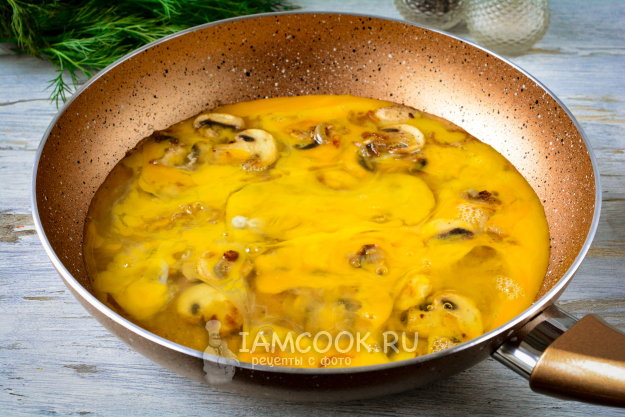 К обжаренным грибам влейте в сковороду яичную смесь. Продолжайте жарить на медленном огне.