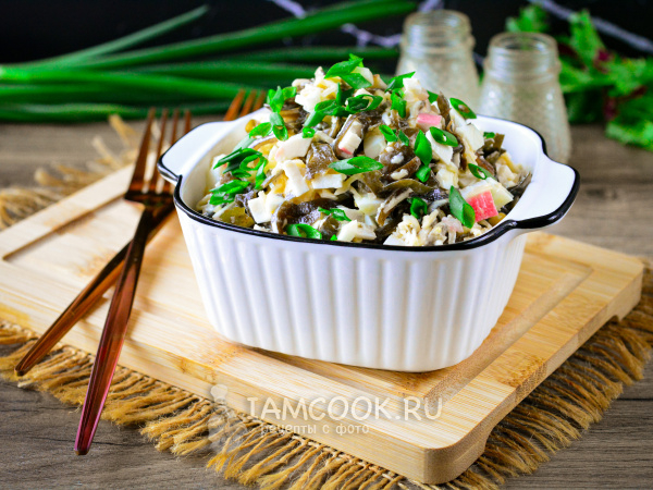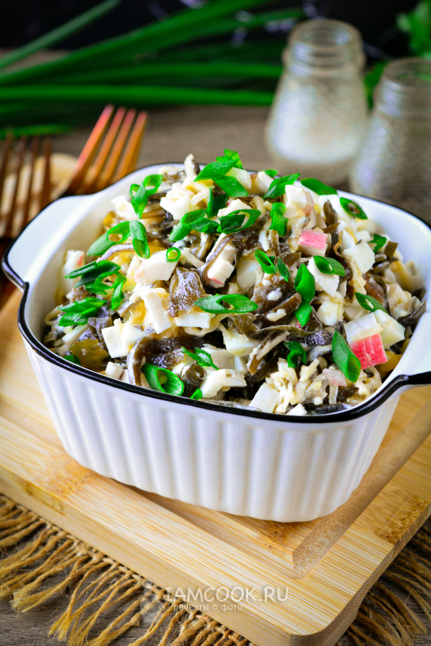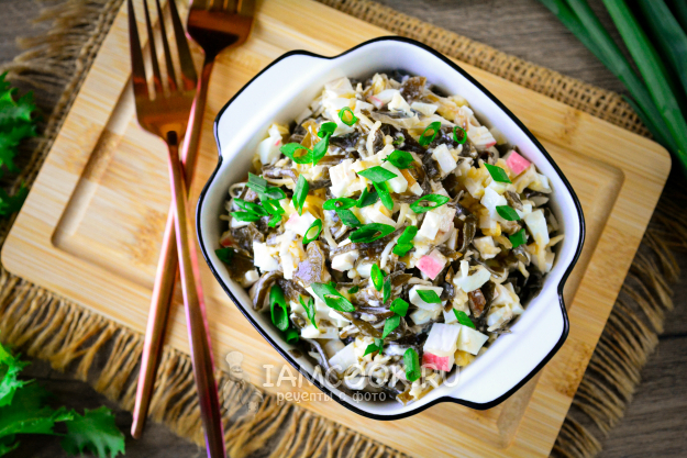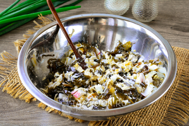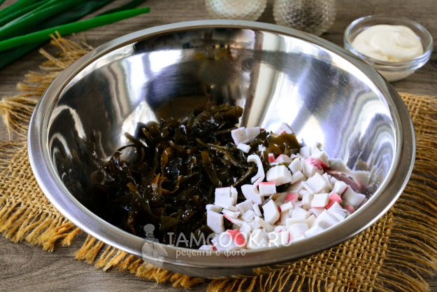 Морскую капусту немного измельчите и выложите в глубокую миску. Туда же всыпьте нарезанные крабовые палочки.