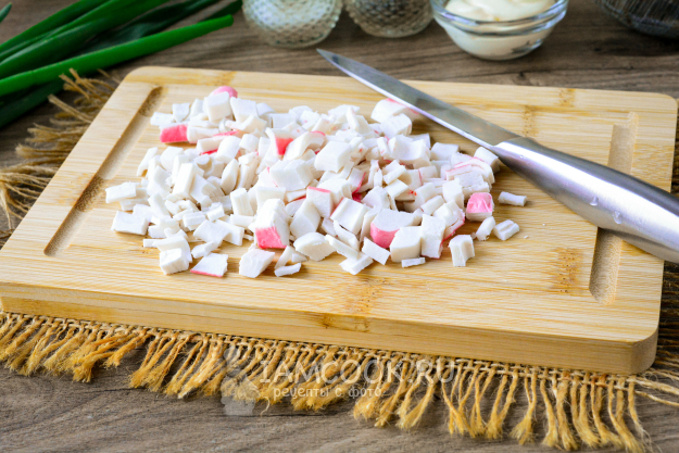 Охлажденные крабовые палочки очистите от упаковки-пленки, затем нарежьте их кубиками.