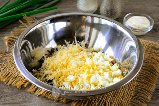 Добавьте в салат яйца и натертый сыр, посолите по вкусу.