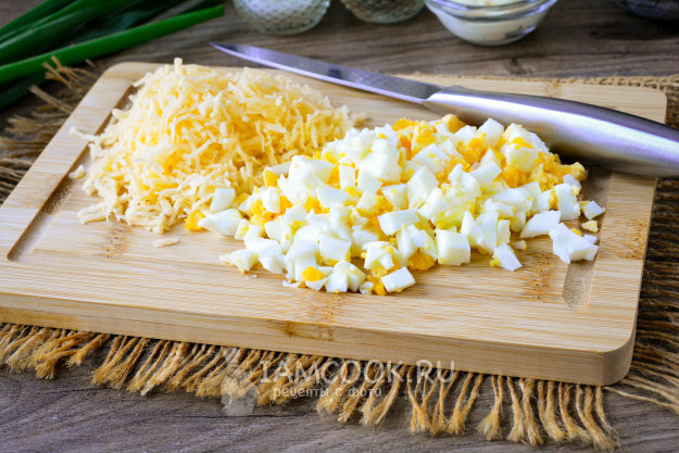 Куриные яйца заранее сварите вкрутую. Варите их в бурлящей воде 7-8 минут, после чего остудите, залив холодной водой. Сваренные яйца почистите и нарежьте кубиками. Твердый сыр (любого сорта) натрите на терке.