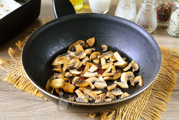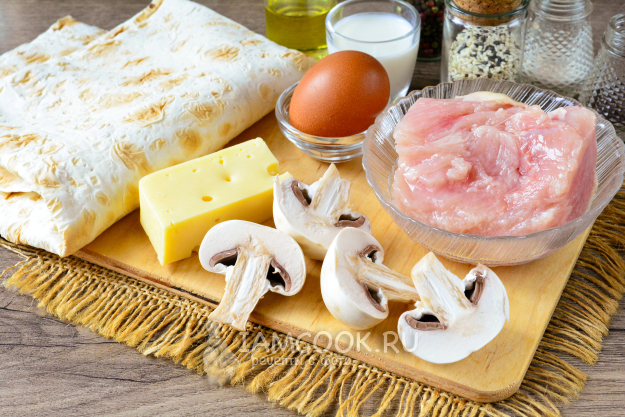 Соберите все ингредиенты для приготовления пирога из лаваша с курицей и грибами.