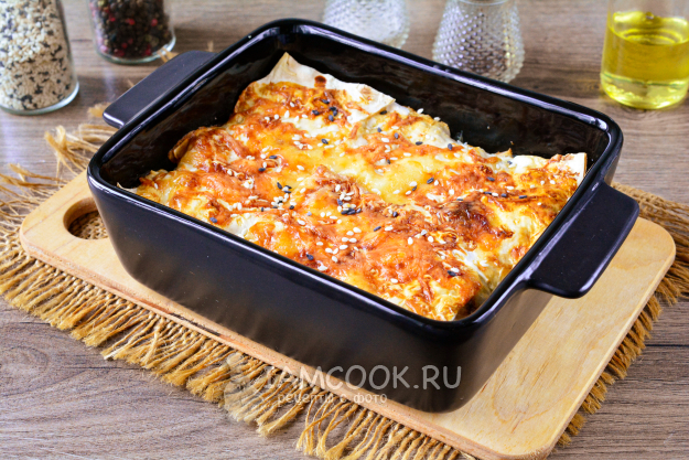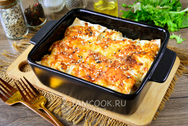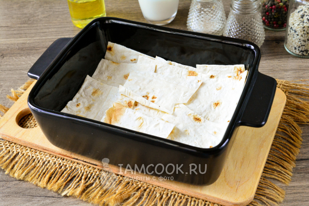 Тонкий лаваш нарежьте средними квадратами или порвите руками. На дно формы для выпекания выложите слой из кусочков лаваша. Благодаря тому, что кусочки будут накладываться друг на друга, пирог будет как бы слоеным.
