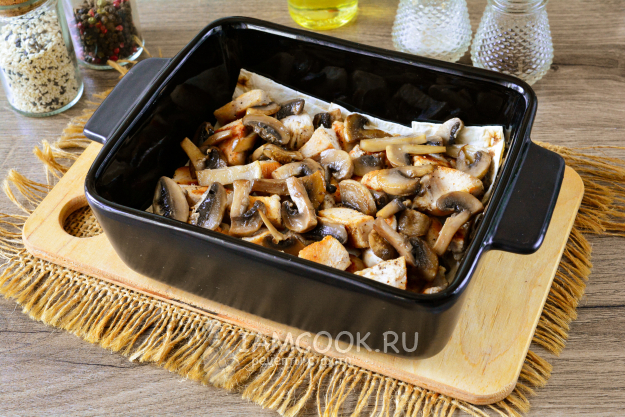 Сверху выложите всю начинку из курицы и грибов.