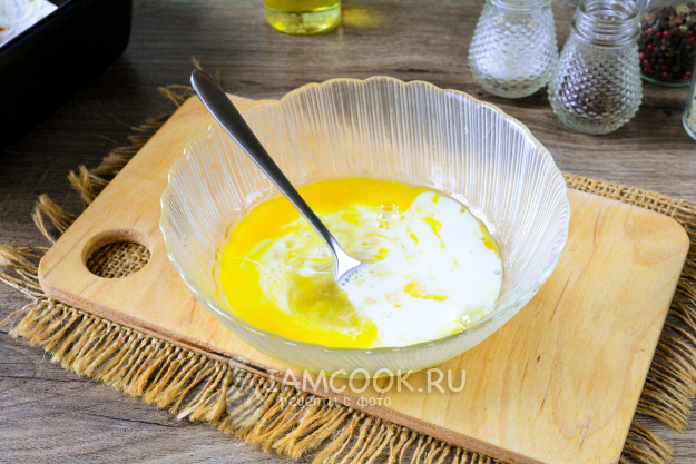 Приготовьте заливку: куриное яйцо взболтайте вилочкой и смешайте со сливками. Добавьте чуть соли.