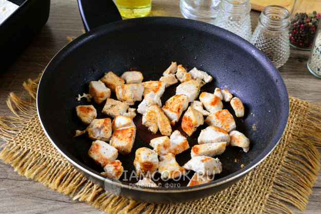Так же и с курицей: выложите мясо на разогретую сухую сковороду, выложите кубики куриного филе, обжаривайте до румяной корочки 3-4 минуты, затем влейте немного растительного масла, добавьте специи по вкусу, перемешайте и жарьте еще пару минут.