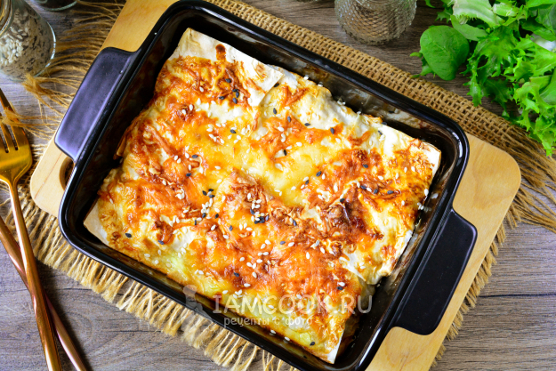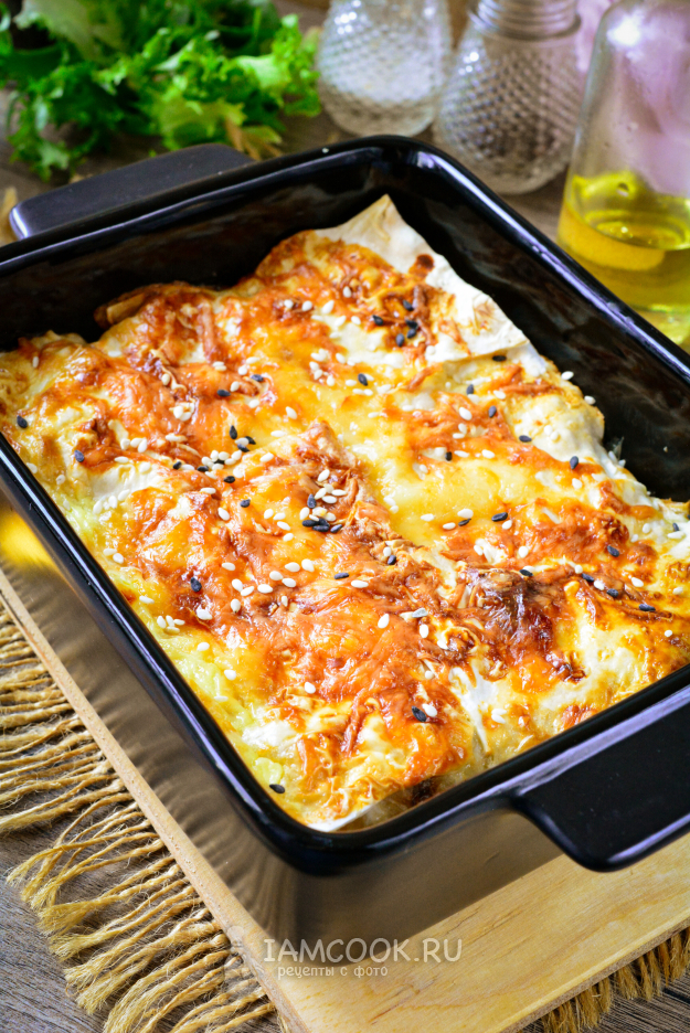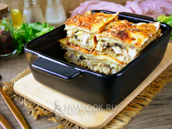 Вкуснейший пирог из лаваша с курицей и грибами подавайте к столу.
