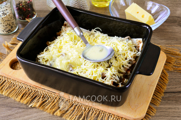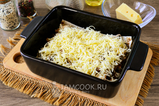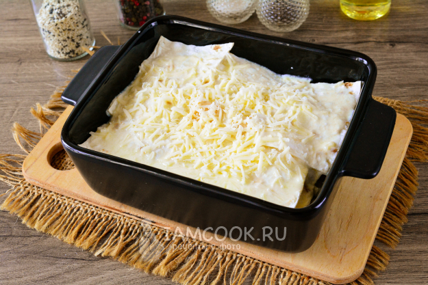 Повторите еще слой из кусочков лаваша, полейте всю поверхность пирога заливкой и присыпьте натертым сыром.