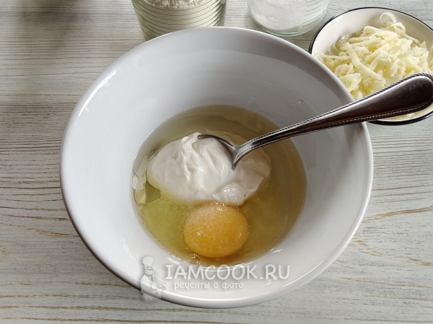 В яйцо добавить масло, сметану, соль и сахар.