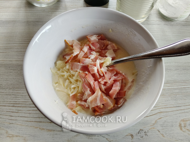 Добавить натертый сыр и нарезанный бекон.