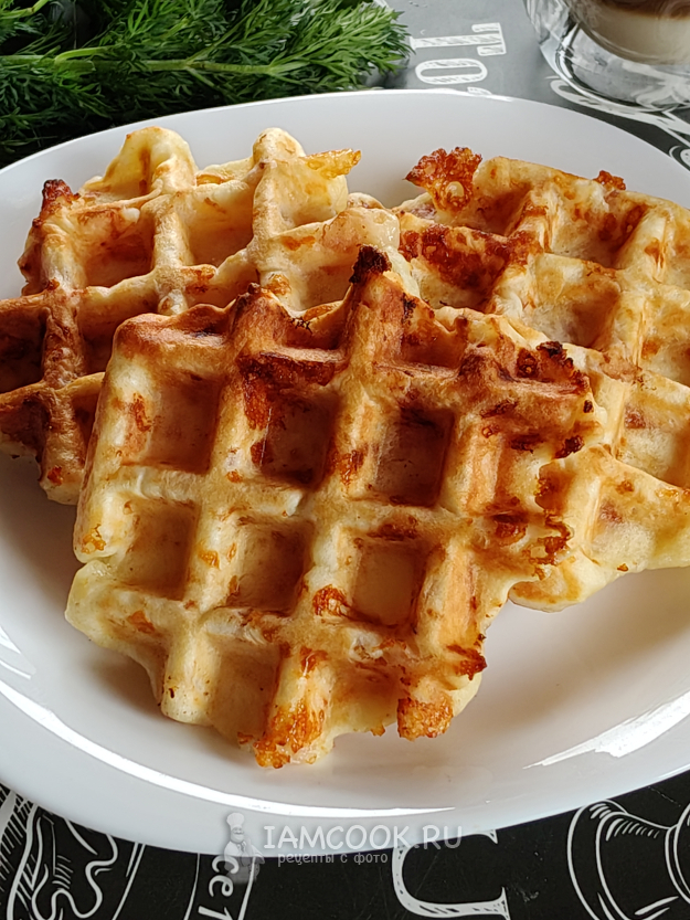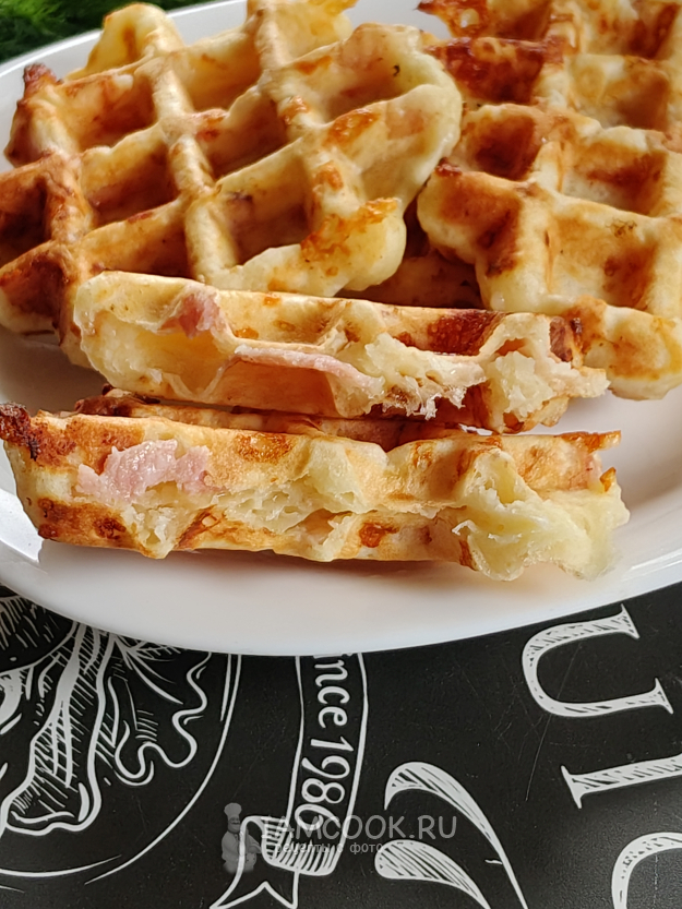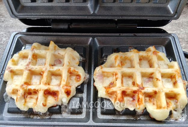 Вафли с беконом и сыром в вафельнице готовы.