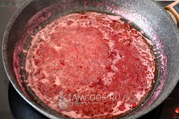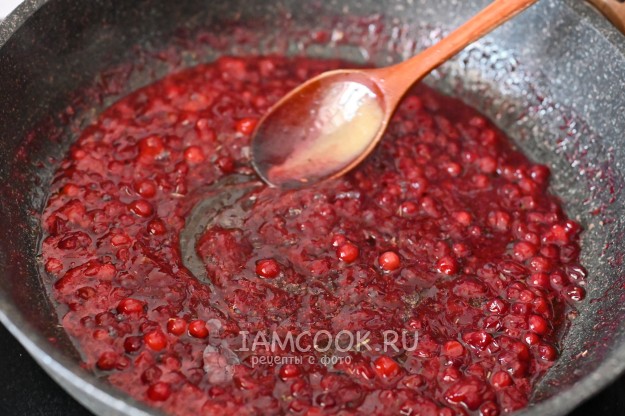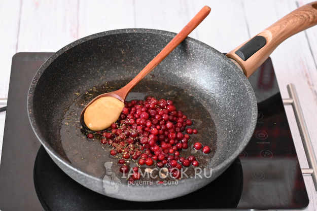 А в эту же сковороду отправьте бруснику (можно замороженную), добавьте щепотку сушёного майорана и мёд.