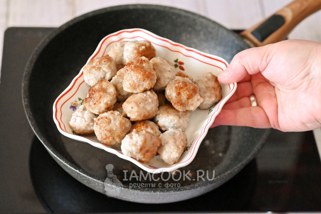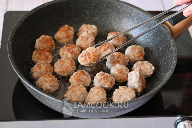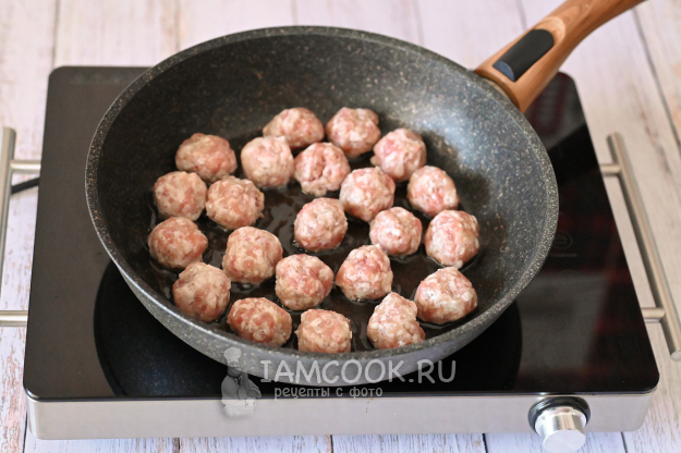 Разогрейте сковороду с маслом на сильном огне и выложите в горячее масло фрикадельки.