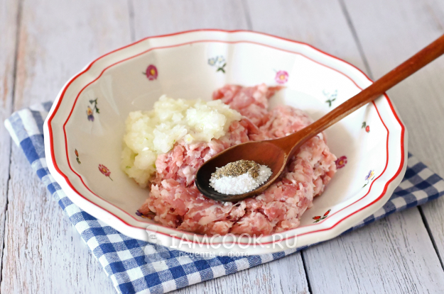 В миску отправьте фарш, добавьте к нему измельчённую на тёрке луковицу. Посолите и поперчите по вкусу.