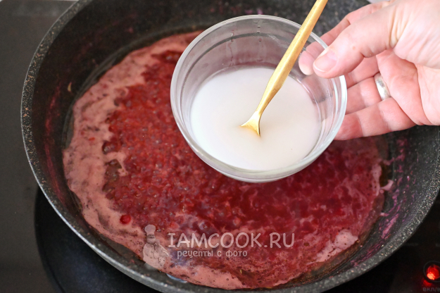 В оставшейся воде разболтайте крахмал и влейте его в соус при постоянном помешивании.