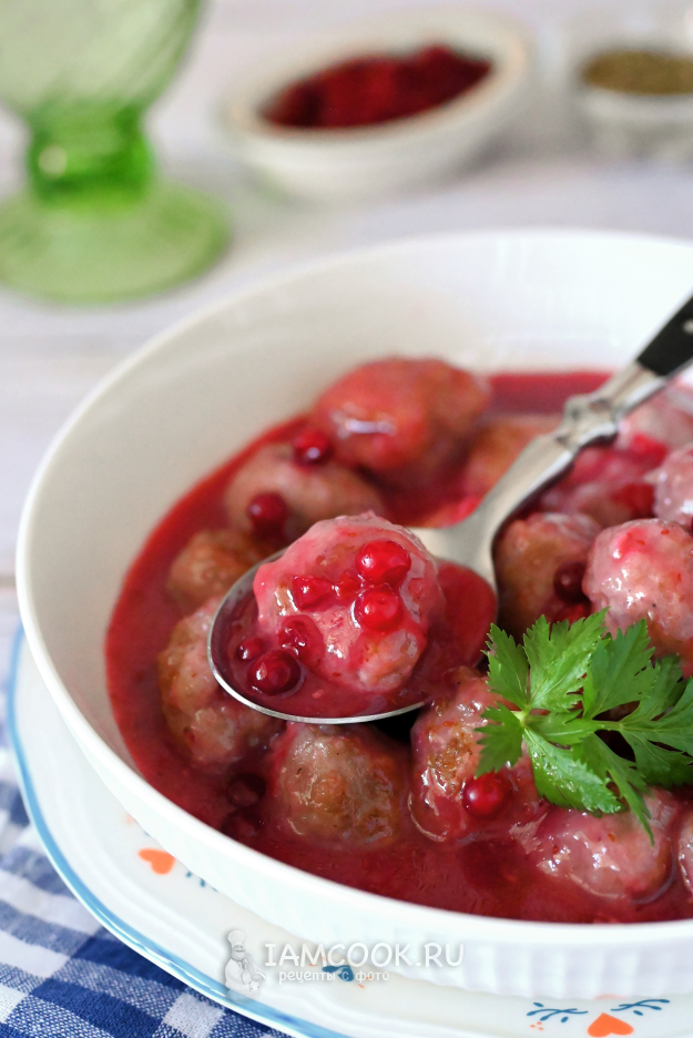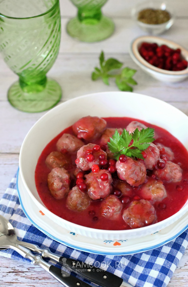 Фрикадельки в брусничном соусе готовы. Подавать можно как самостоятельное блюдо с гарниром или без него. Также эти яркие фрикадельки можно подать в небольших керамических кокотницах в качестве горячей закуски (тогда на порцию достаточно будет 3-4-5 штучек).