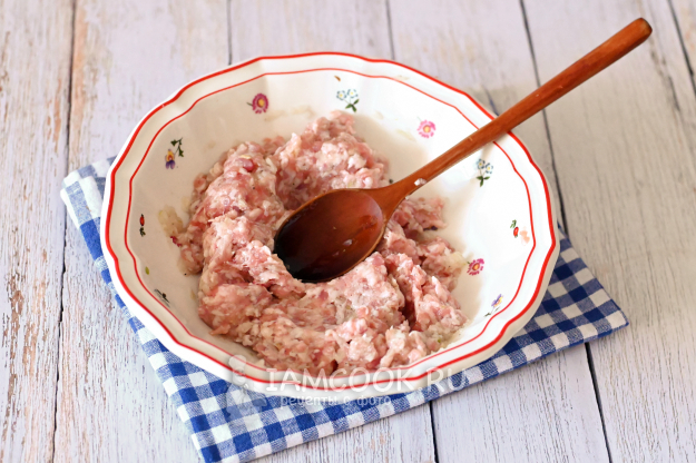 Фарш у меня смешанный - 70% свинины и 30% говядины. Можно брать только свиной или только говяжий фарш, также отлично подойдёт фарш из бедра индейки. Куриный тоже можно, но только если вы его приготовите сами (из покупного куриного фарша порой сложно что-то слепить).