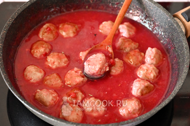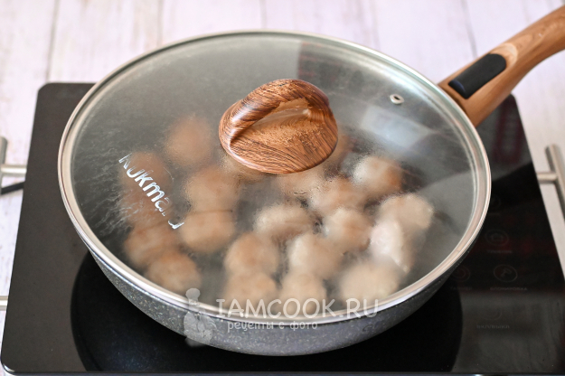 Затем убавьте огонь до минимума, накройте сковороду крышкой и доведите фрикадельки до готовности (примерно 12-15 минут).