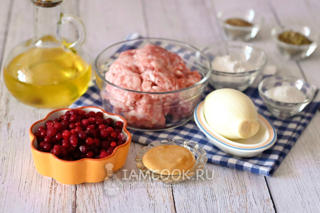 Соберите необходимые продукты для приготовления вкуснейших фрикаделек в брусничном соусе.