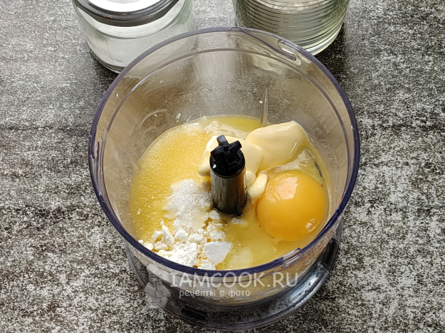 В чашу блендера положить творог, добавить сахар, соль, ванилин, яйцо и растопленное масло.