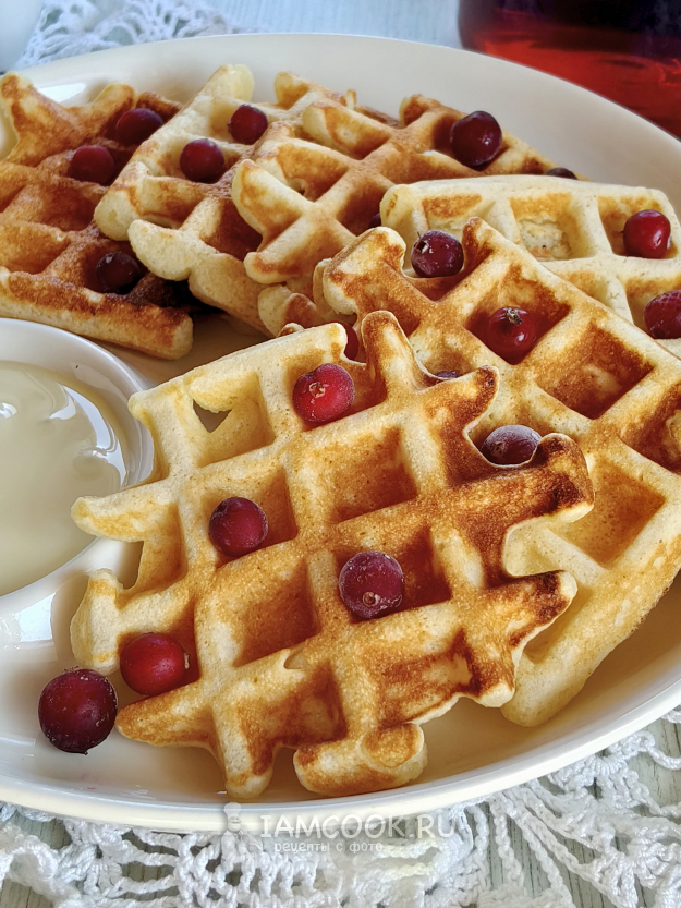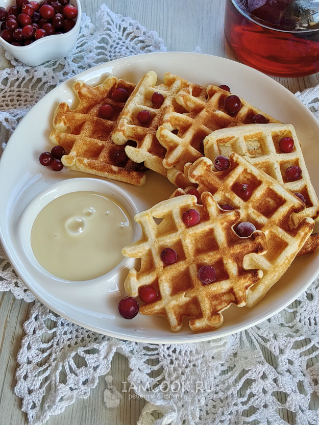 Манные вафли вкусно есть со сгущенкой и ягодой.
