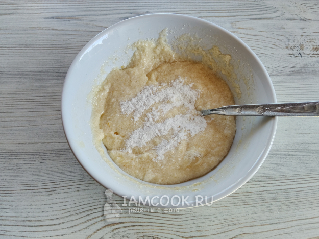 Перемешать, добавить разрыхлитель и снова перемешать.