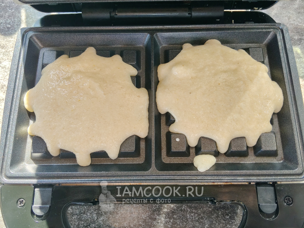 Вафельницу разогреть. Вылить на панели тесто, чтобы заполнилась большая часть.