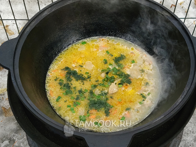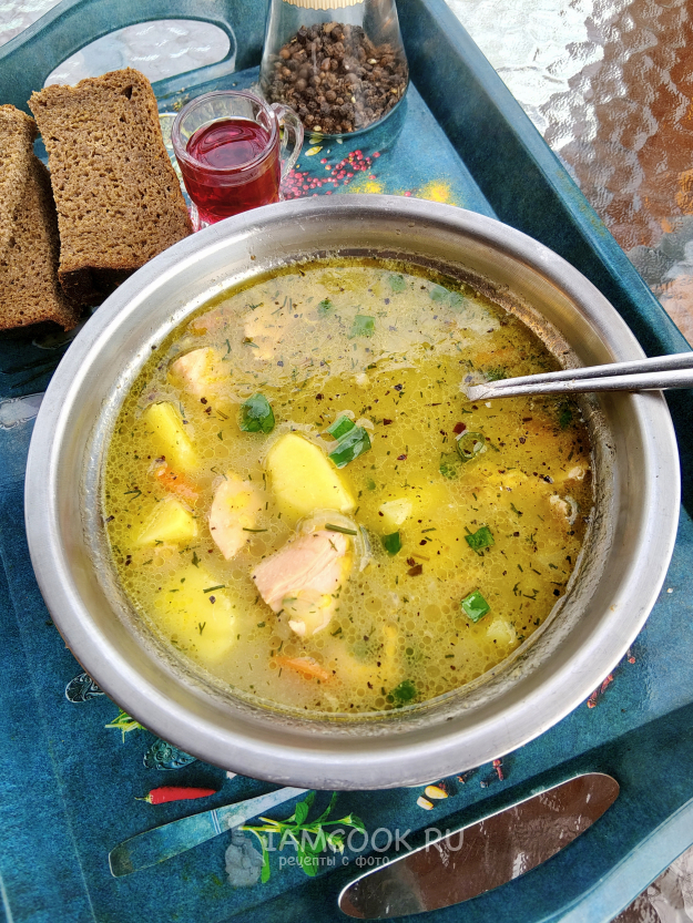 Варить уху из горбуши в казане на костре на медленном огне до готовности картофеля, а после добавить в казан рыбу, лавр, зелень и черный перец по вкусу.
