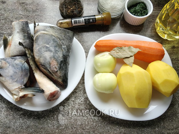 Вот такие продукты я взяла, чтобы приготовить уху из горбуши в казане на костре.