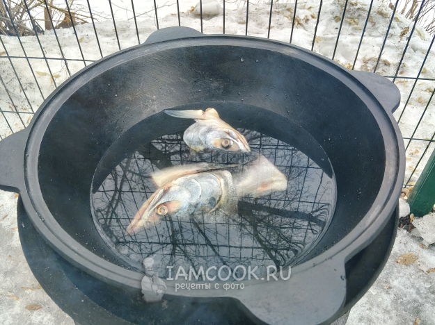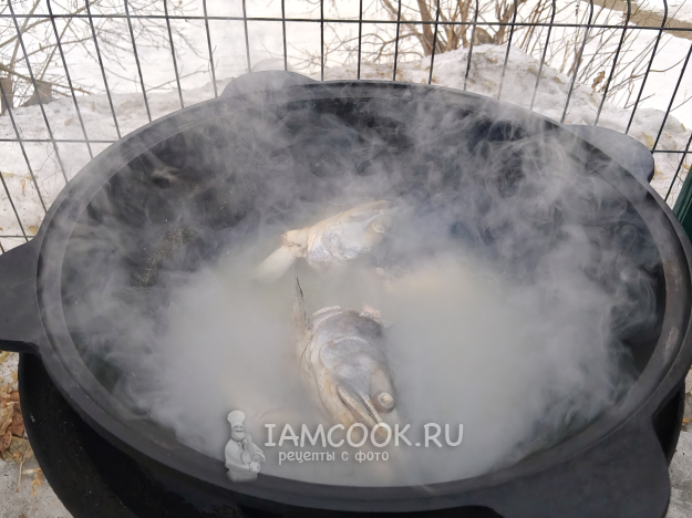 Казан поставить на огонь. Отправить в него рыбу, залить водой.
