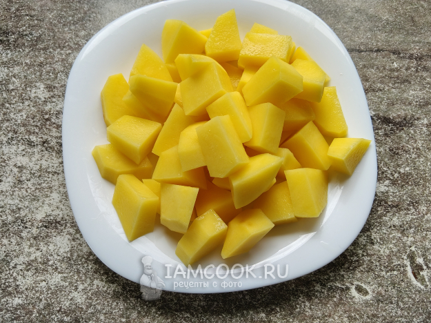 Картофель нарезать кубиками. Морковь и лук подготовить, как на зажарку.