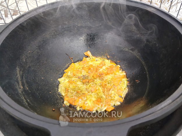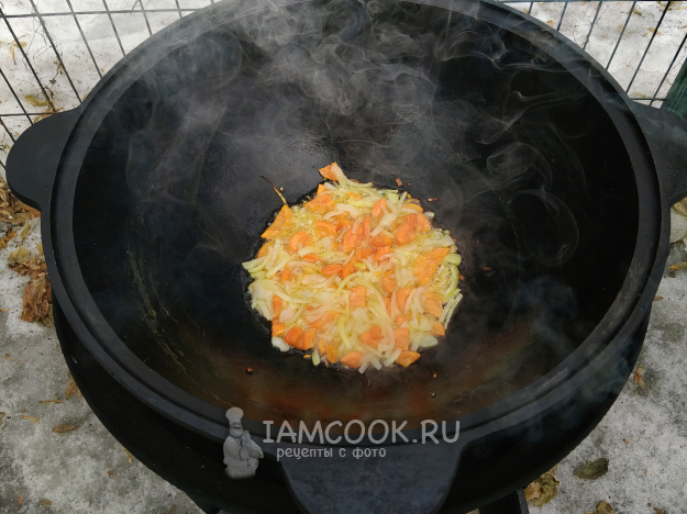 В казане нагреть масло, а после обжарить овощи, помешивая.