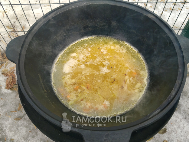 Добавить в казан картофель, залить бульоном, можно добавить еще воды, если требуется. Посолить.