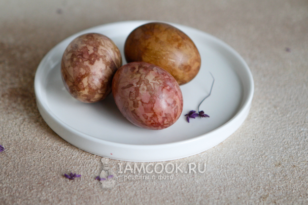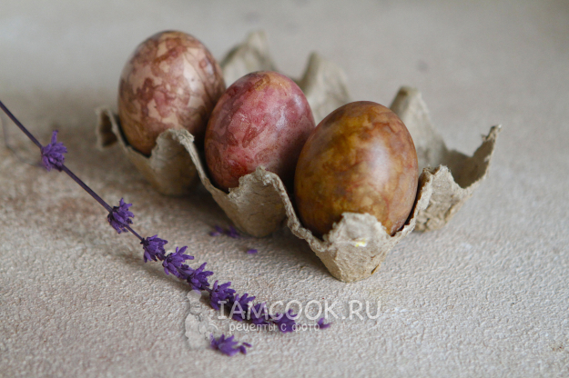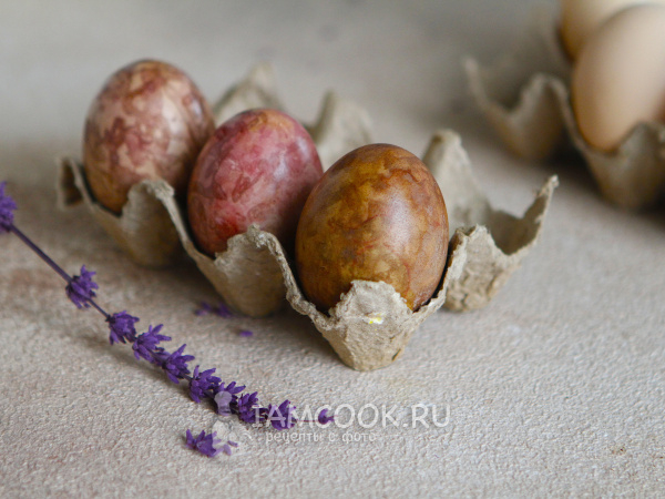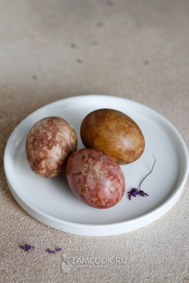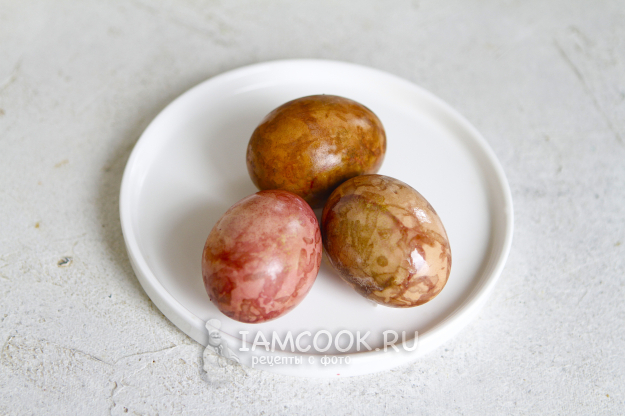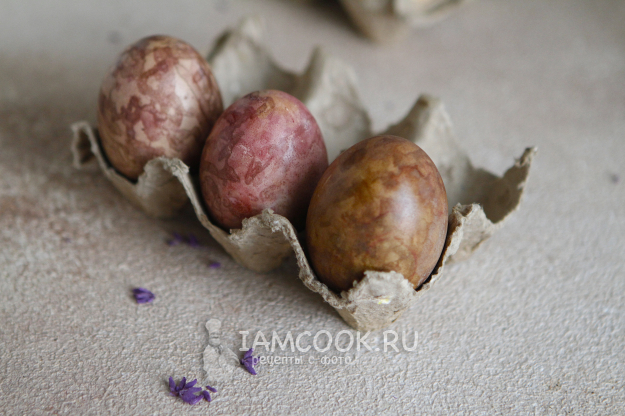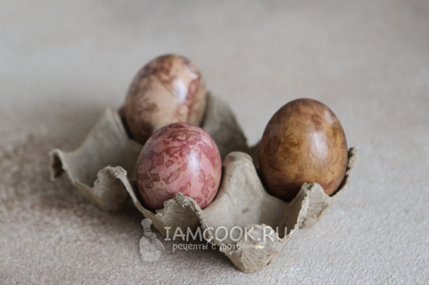 В процессе окрашивания яиц в свекле пигмент свекольной кашицы ложится неровно, поэтому получается мраморный рисунок.