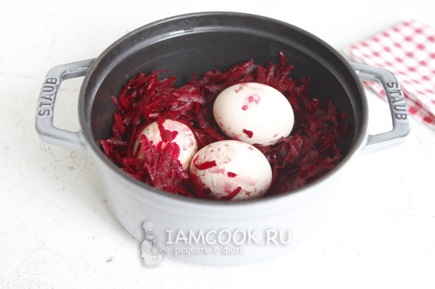 Перемешайте свёклу и уложите в кашицу отваренные яйца (яйца должны быть полностью закрыты свекольной кашицей). Оставьте яйца в кашице на 30-90 минут. Чем дольше яйца будут находиться в свекольной кашице, тем насыщеннее получится окрас.