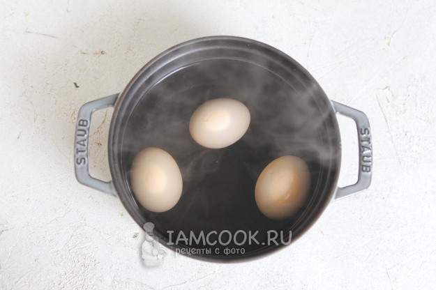 Воду доведите до кипения и слегка посолите. Убавьте огонь и варите яйца 10-12 минут.
