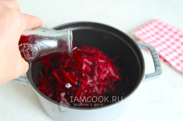 В натертую свеклу влейте уксус, я добавляла свекольный уксус. Не рекомендую пропускать этот шаг, так как именно уксус помогает закрепить цвет.