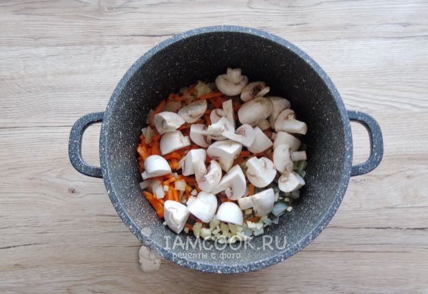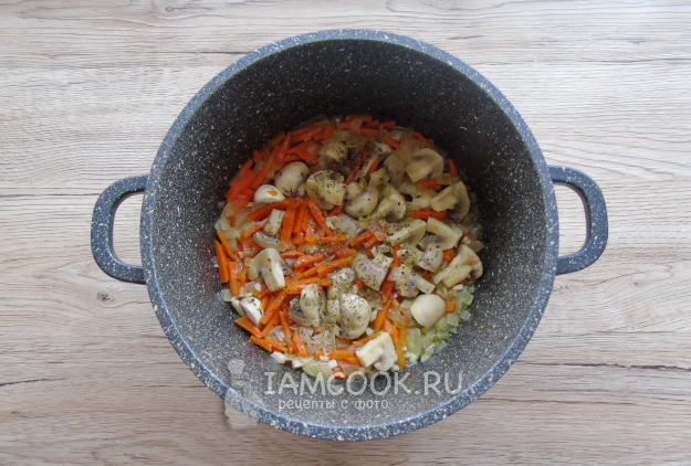 Тушите морковь и лук с грибами и чесноком до готовности. Посолите и поперчите.