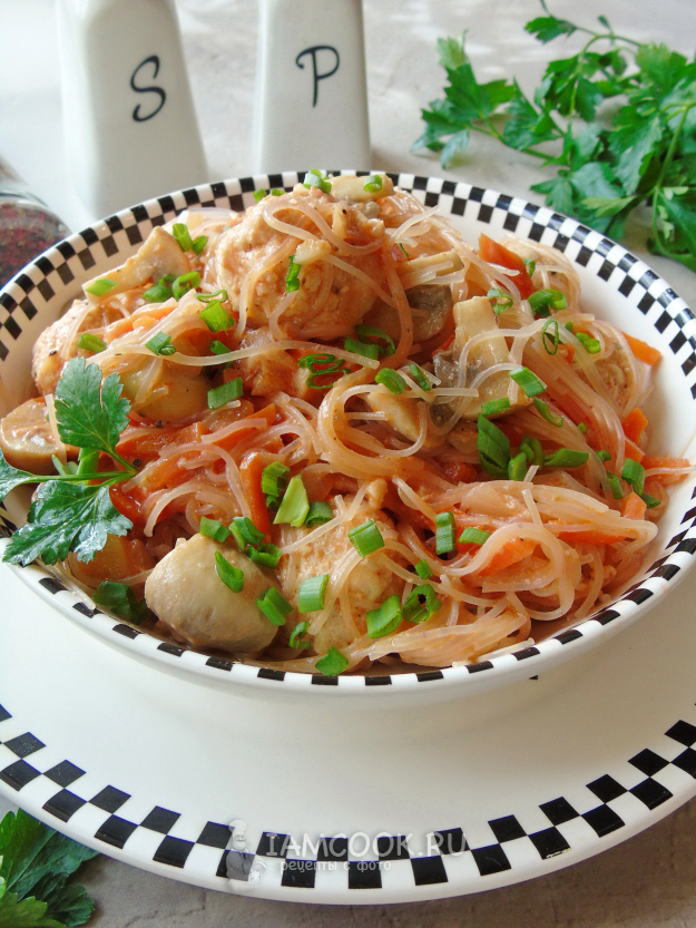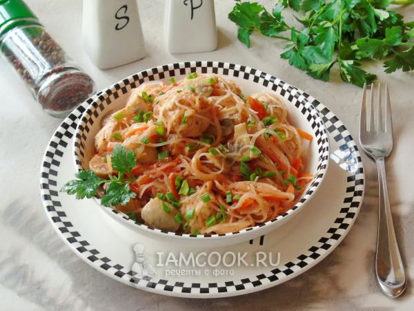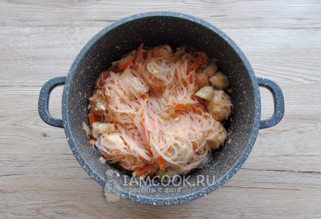 Перемешайте фунчозу с овощами, грибами, фрикадельками и соусом.