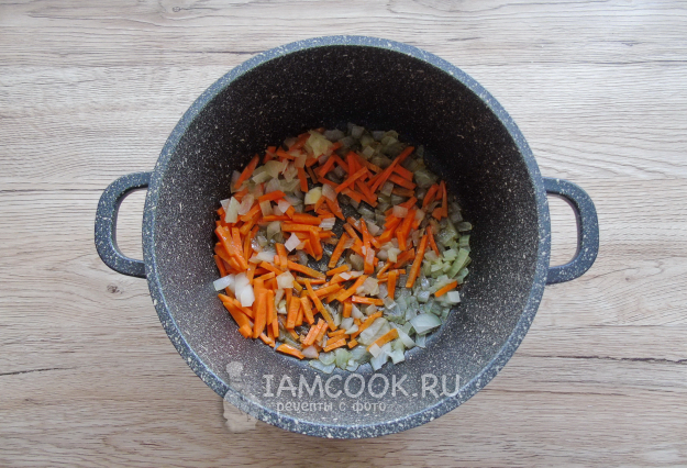 Налейте растительное масло и пассеруйте овощи 7-8 минут.