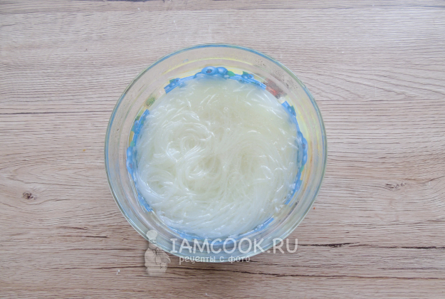 Фунчозу нарежьте ножницами, чтобы было удобнее есть. Выложите в миску и залейте кипятком. Накройте крышкой и держите в кипятке 5 минут.